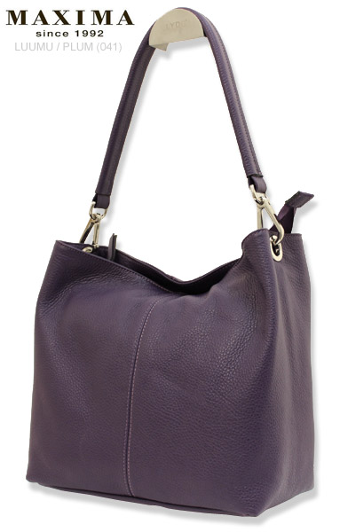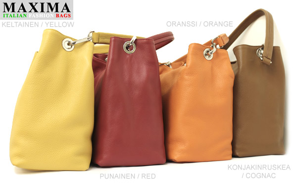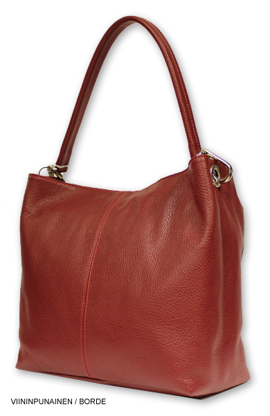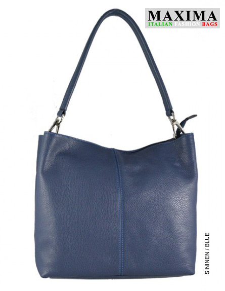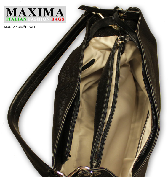Maxima Italian Fashion Bags naisten nahkainen olkalaukku D893. Naisten 2-osainen olkalaukku. Laukku suljetaan vetoketjulla ja laukun sisällä keskellä vetoketjutaskullinen jakaja. Laukun reunoilla sisällä yksi vetoketjutasku ja yksi avotasku esim puhelimelle tai avaimille. Laukku samanlainen kummaltakin puolelta. Maxima-laukku on aitoa nahkaa ja tehty Italiassa.