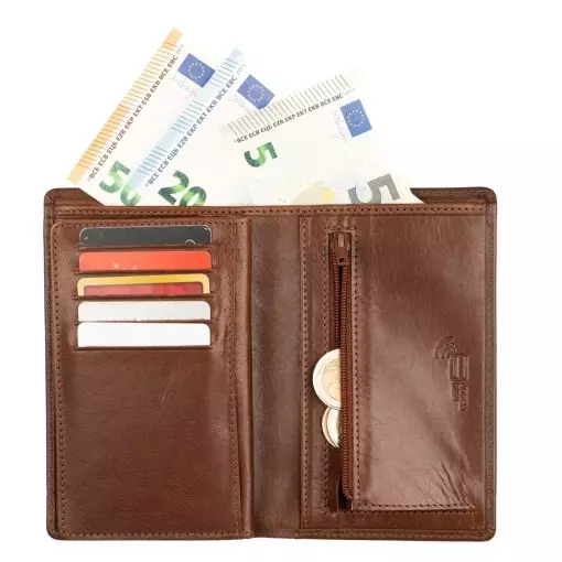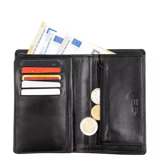 Nahkalompakko jossa 11 korttipaikkaa ja useita muita välejä. Yksi korttipaikoista on ikkunallinen ja sopii hyvin esimekiksi isolle ajokortille. Vetoketjullinen kolikkotasku ja taustalla seteliväli. Lompakko on RFID-suojattu ja kiinniollessaan estää lähimaksukorttien etäluvun.