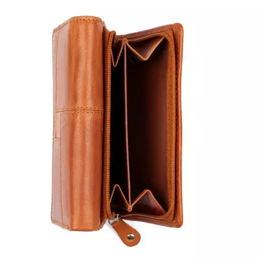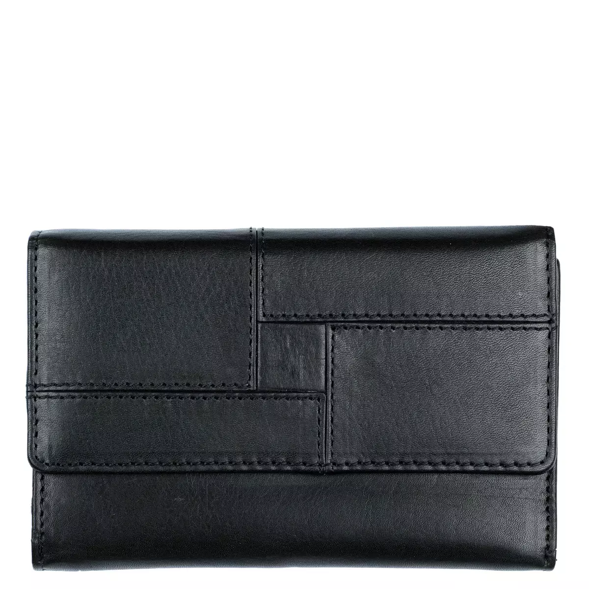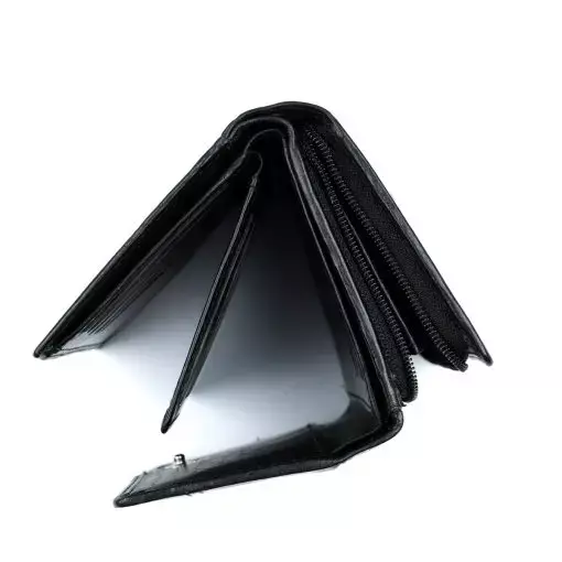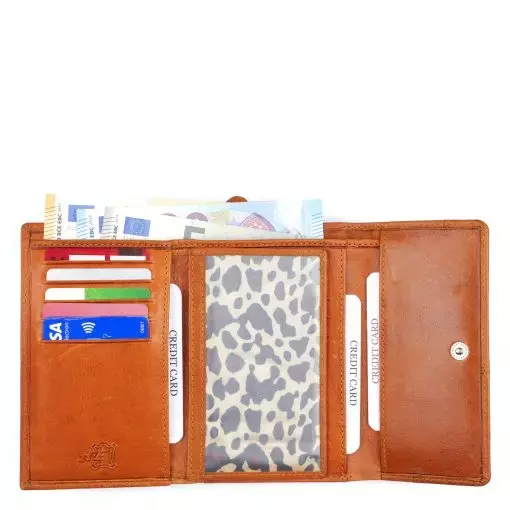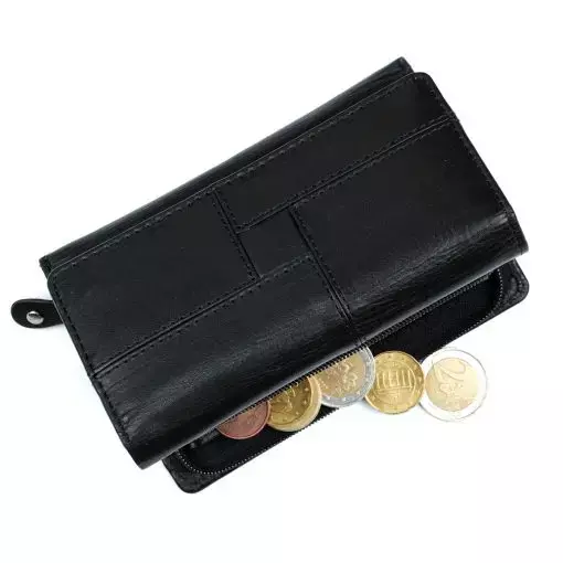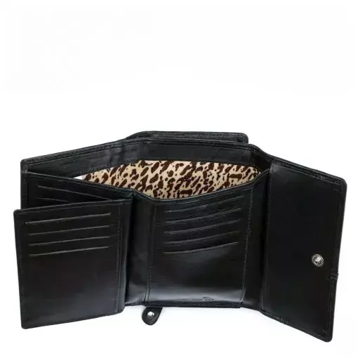 Monipuolinen nahkalompakko koristetikkauksella. Neppariläpän takana jopa 14 korttipaikkaa, iso ikkunallinen korttipaikka esimerkiksi ajokortille sekä useita muita välejä. Taustalla seteliväli ja lompakon takapuolella on vetoketjullinen kaksiosainen kolikkotasku. Mitat:13×9,5×3 cm.