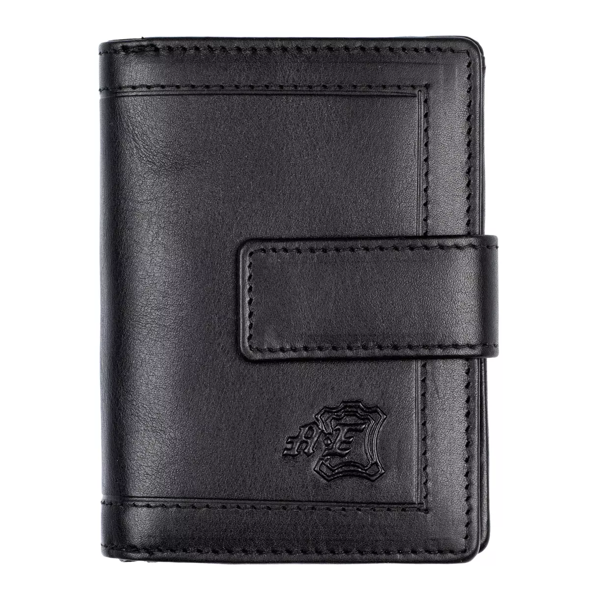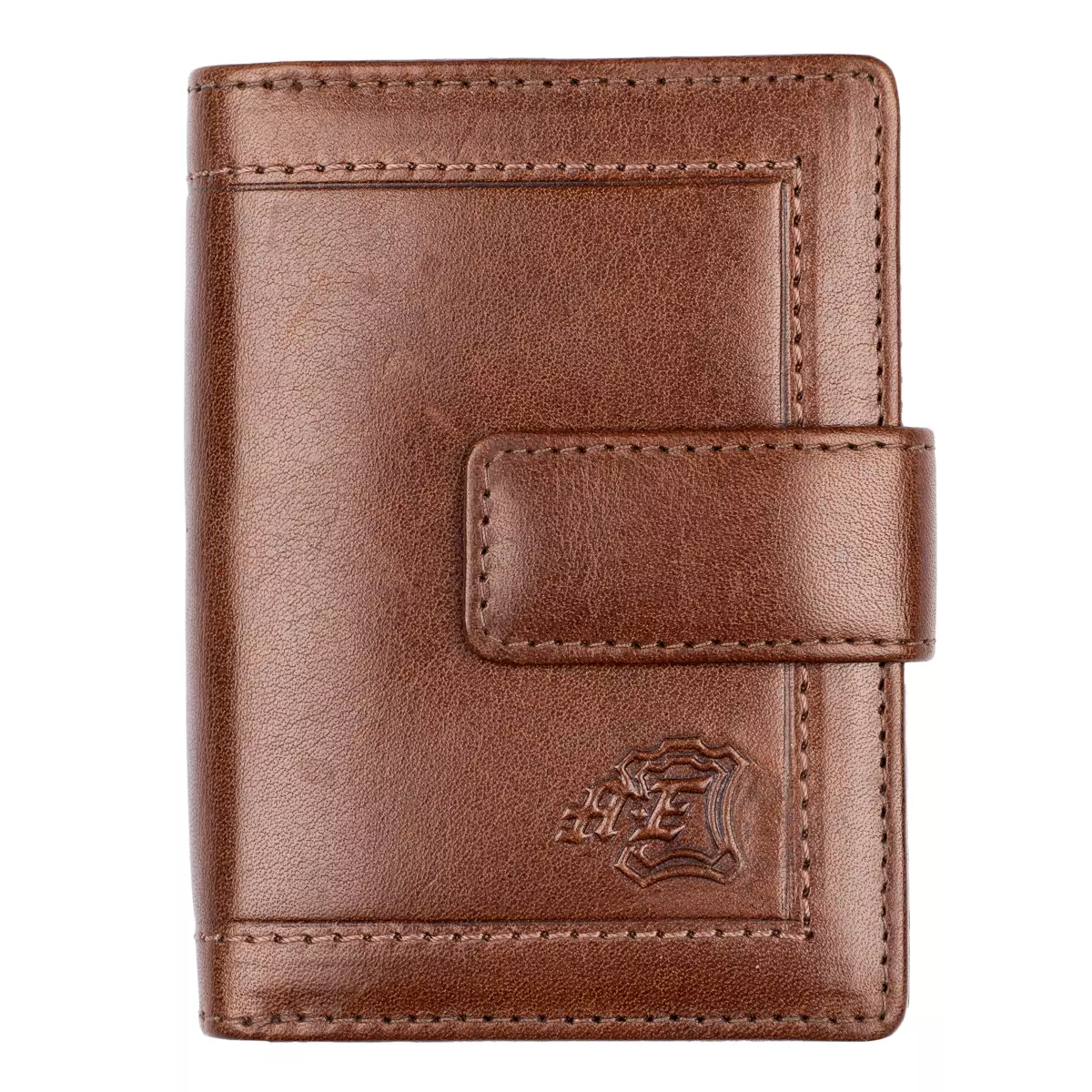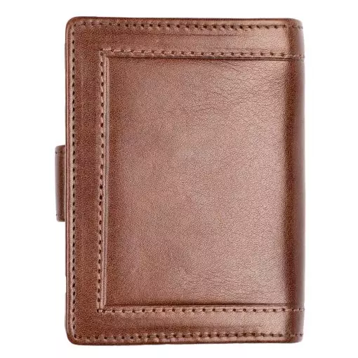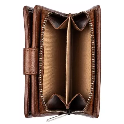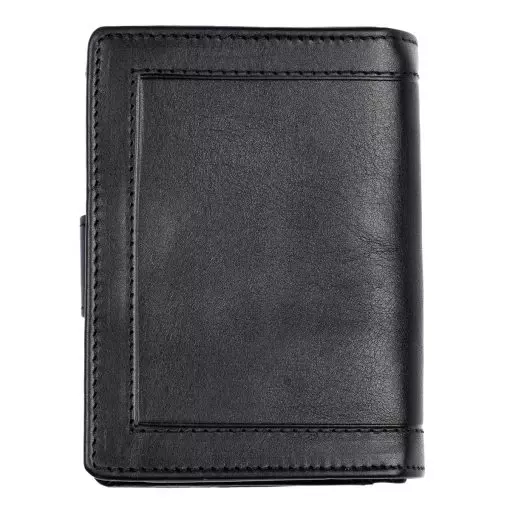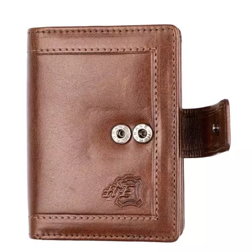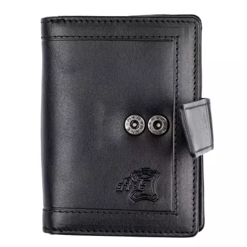 Gullkrona-malliston pieni nahkalompakko tuplanepparilla. Nepparin takana kahdeksan korttipaikkaa ja taustalla seteliväli. Kolikoille kaksiosainen vetoketjutasku. Mitat 8 x 10 cm.