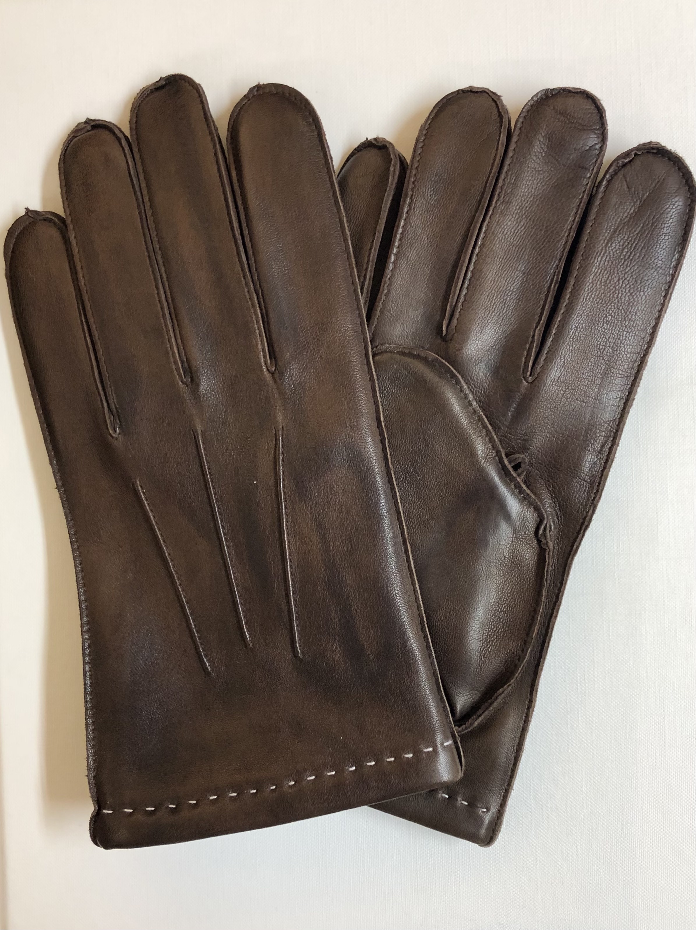 Klassinen miesten hansikas lammasnapasta. Fleece-vuori ja valkeat koristetikkaukset hanskan suussa. Valmistaja Mutka.