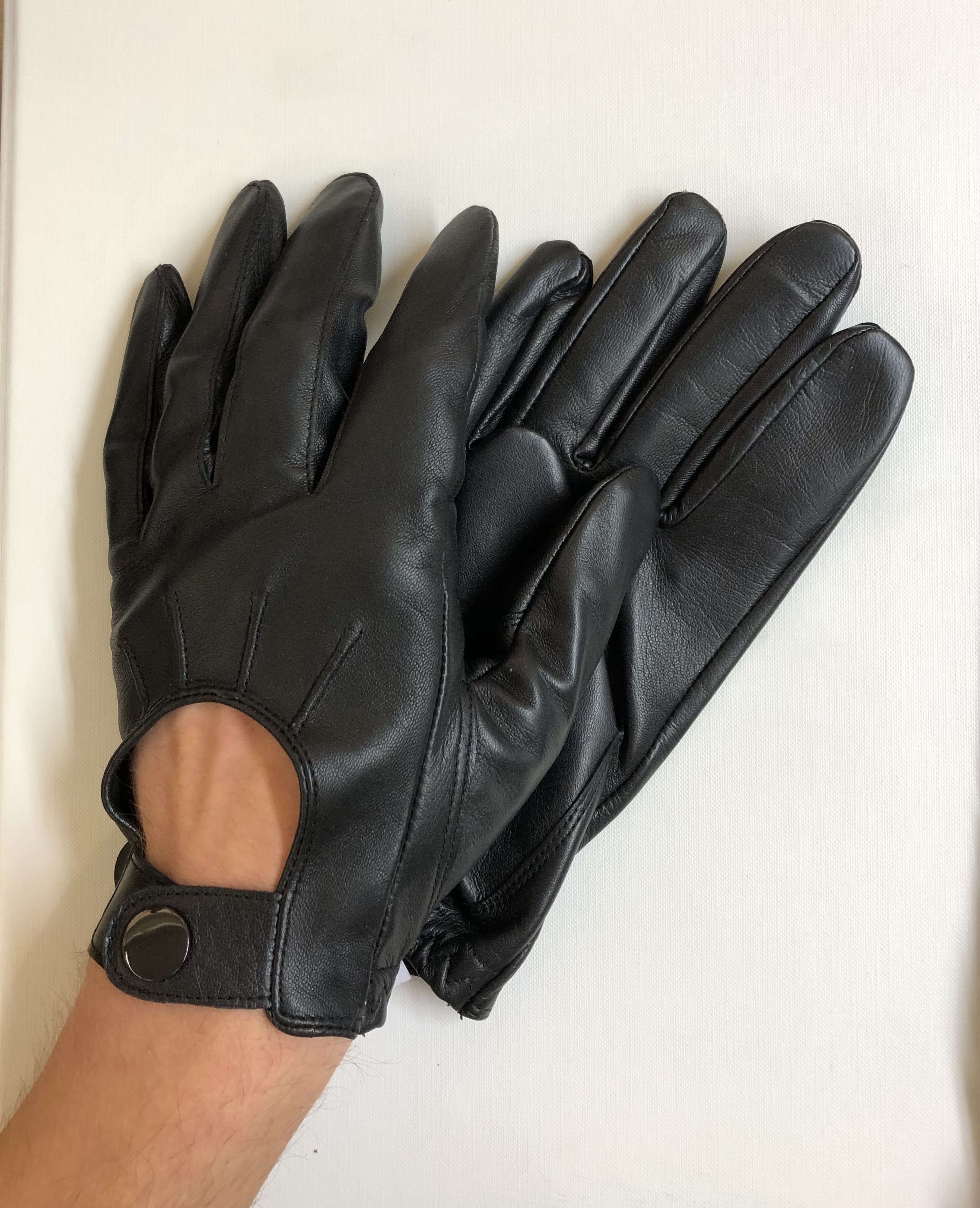 Miesten lammasnappainen vuoriton ajohanska. Ranteessa istuvuuden takaamiseksi sisäpuolella kuminauha ja käden selkäpuolella nepparikiinnitys. Mutkan hanskassa kämmenselässä aukko ja neljä ommeltua yksityiskohtaa.