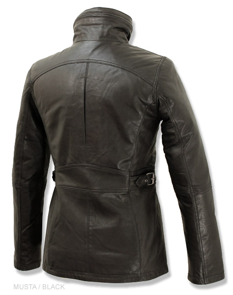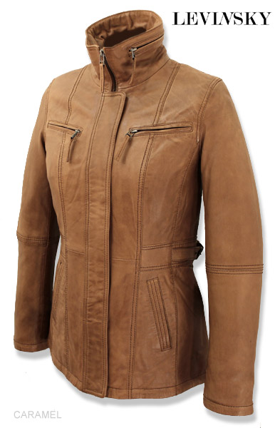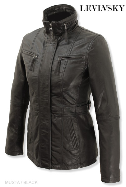 Naisten nahkatakki ohuella vuorella - Zurich Levinsky. Naisten Zurich nahkatakissa on ohut 40g/m² vanutäyte, joten se käy hyvin syys- tai kevätkäyttöön. naisten takki on aitoa nahkaa, pehmeää lammasnappaa ja sisäpuoli 100% polyesteriä. Nahkatakin edessä 2 vetoketjullista rintataskua ja 2 avotaskua käsille. sisäpuolella 2 avopovitaskua. Niskassa piilovetotasku ja takin kiinnitys vetoketjulla ja näppäreillä. Takin värit musta ja caramel.