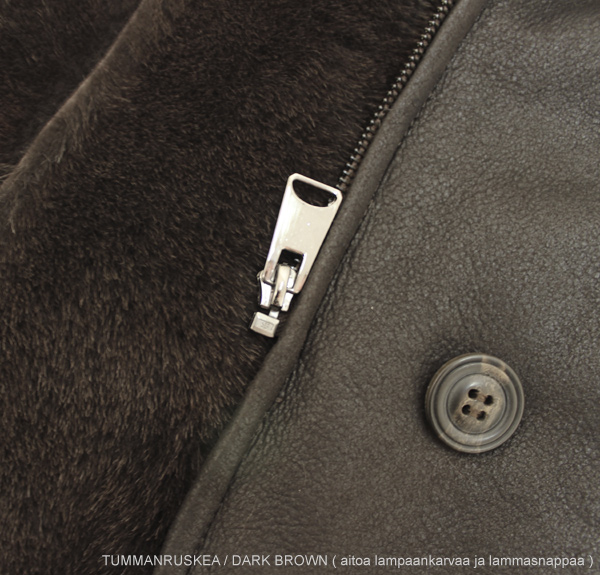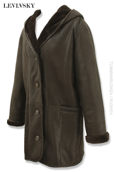 Naisten lampaankarvainen kelsiturkki - nappalaturkki Panda Levinsky. Lämmin naisten talviturkki aitoa nahkaa, lampaannahkaa. Takin sisus, kaulus, huppu ja hihat on lämmintä aitoa lampaankarvaa. Naisten talviturkin etupuolella 2 avotaskua käsille ja sisäpuolella 2 vetoketjupovitaskua. Karvakauluksen saa käännettyä nätisti hupuksi suojaamaan kampausta. Kelsiturkkia kahta väriä ruskea ja tummanruskea. Talvitakissa veoketju- ja nappikiinnitys.